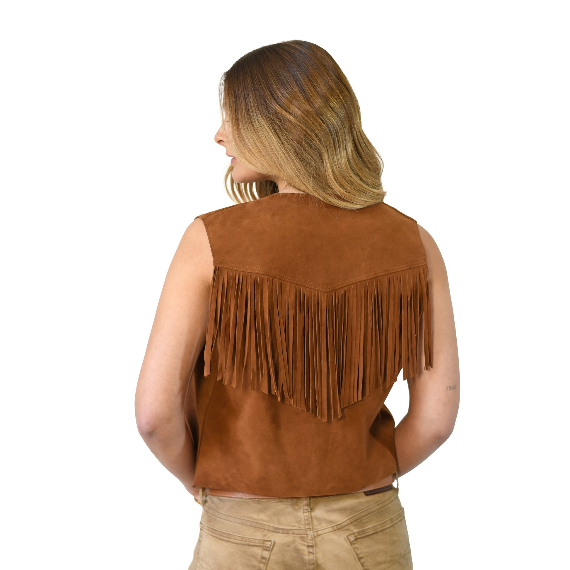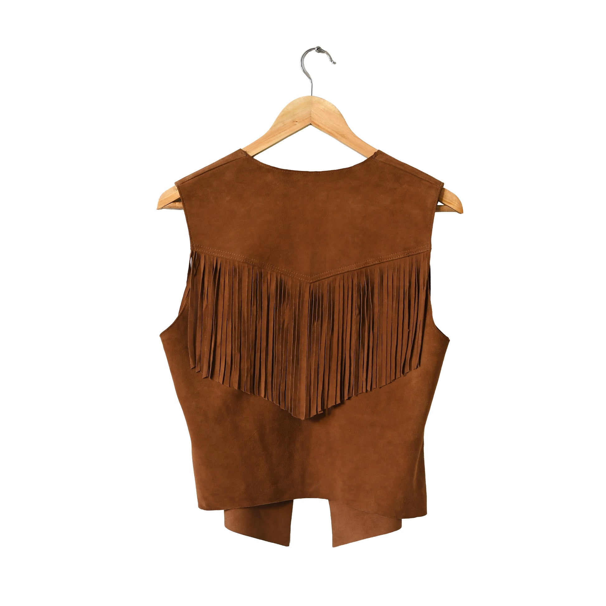 Chaleco de gamuza, sin forro, con flecos en la espalda. Delgado. Full tendencia!!