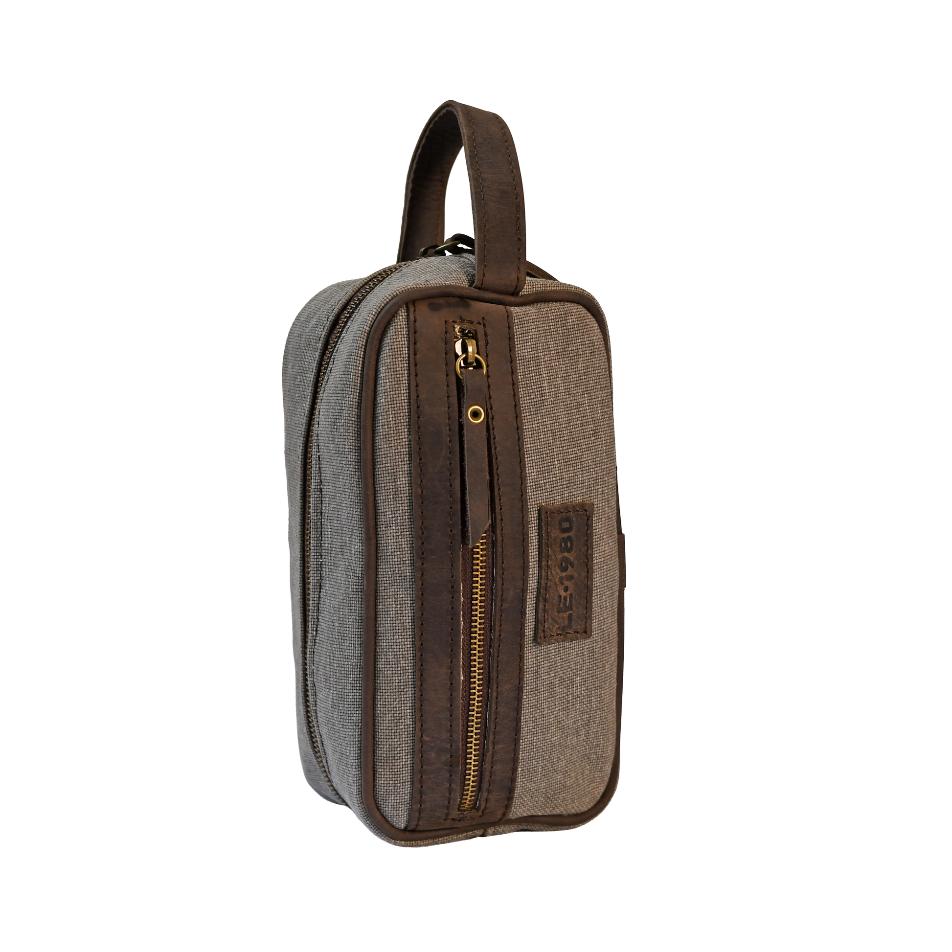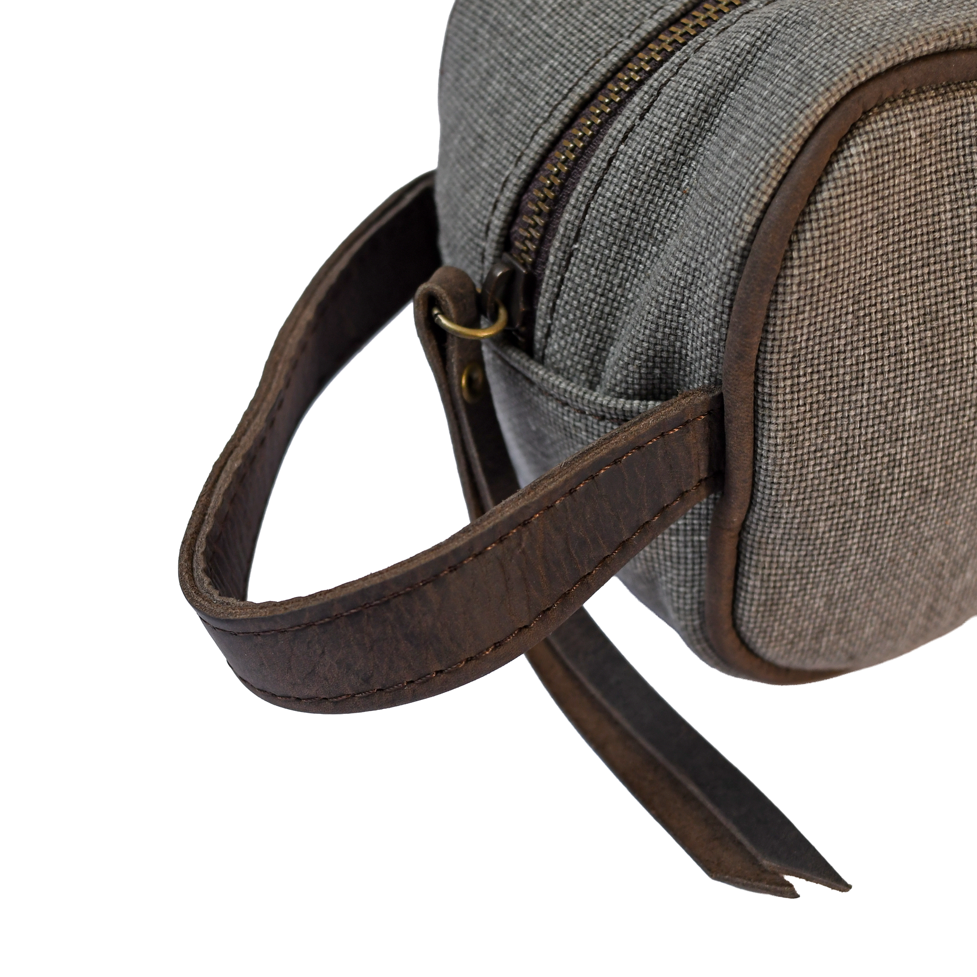Neceser en una fina mezcla de tela gruesa y cuero de vacuno engrasado, con muñequera, forrado en su interior.