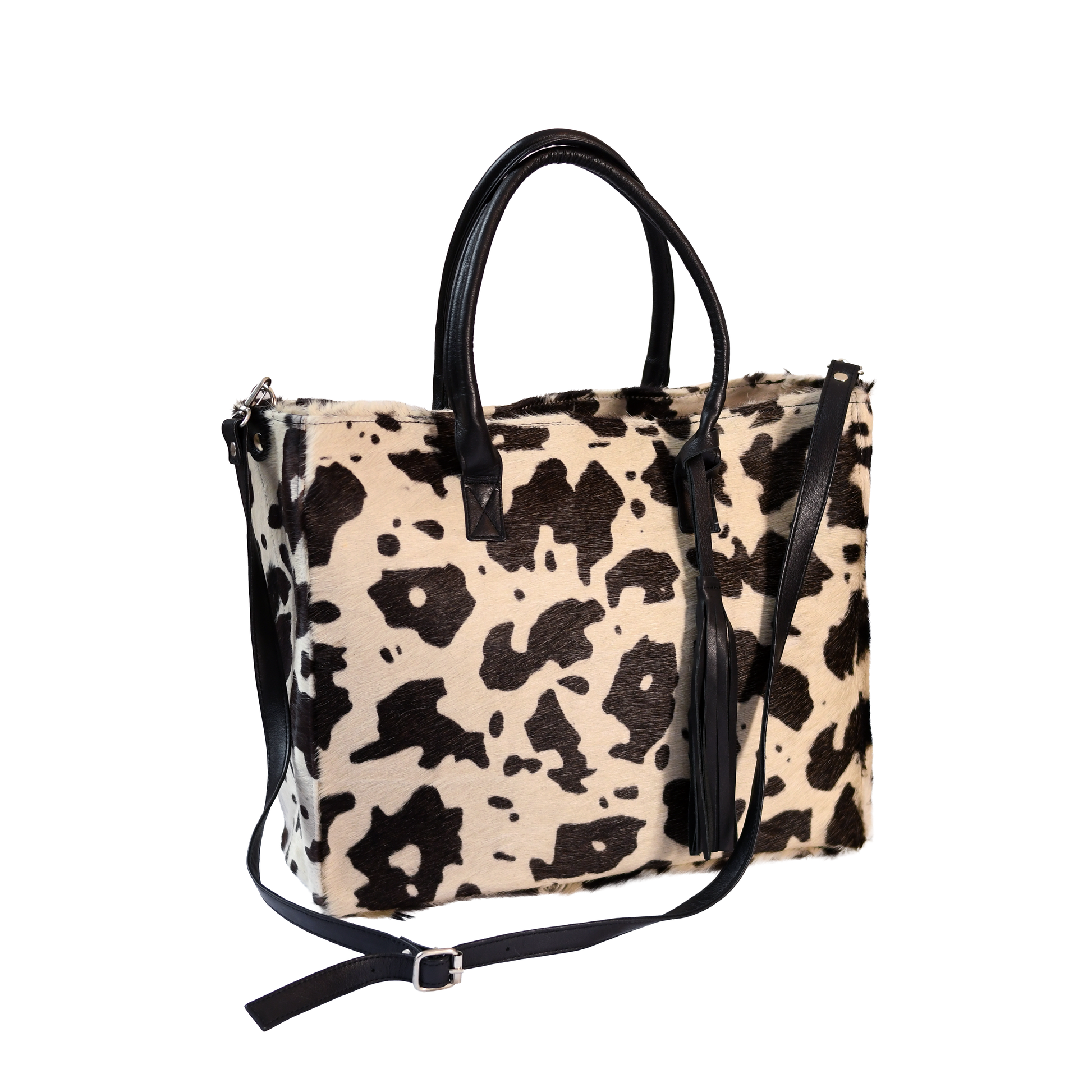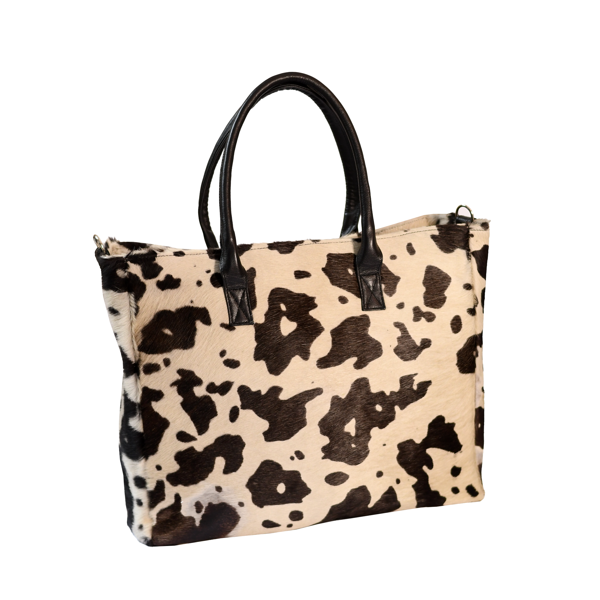 Maravilloso y estiloso Tote Bag, en pelo de vaca, full tendencia, con 1 compartimiento, bolsillo interno y forrado en su interior. 47 cm largo y 37 cm alto.